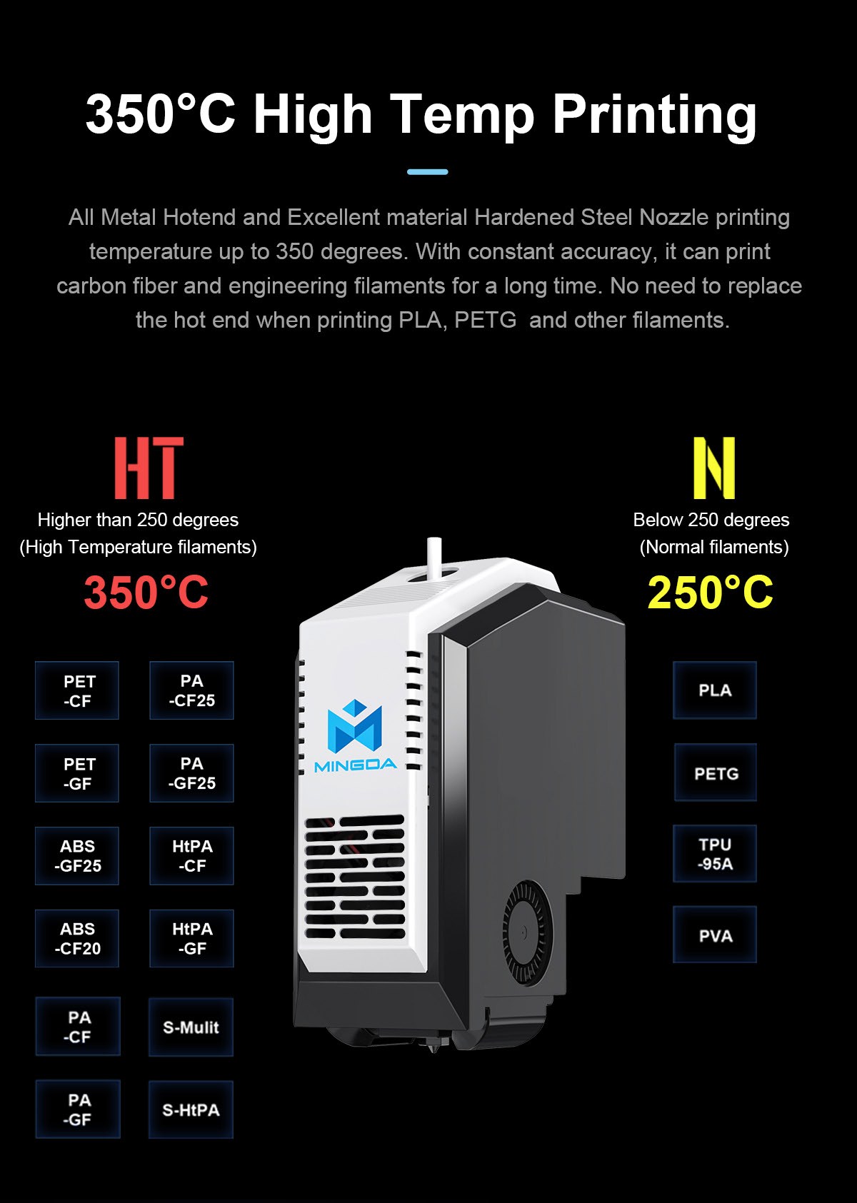 - Engineering filament: HtPA, PET-GF, PET-CF, PA12-CF, HTPA-GF, HTPA-CF, ABS-GF25, ABS-CF20, PA-GF25, PA-CF25, etc