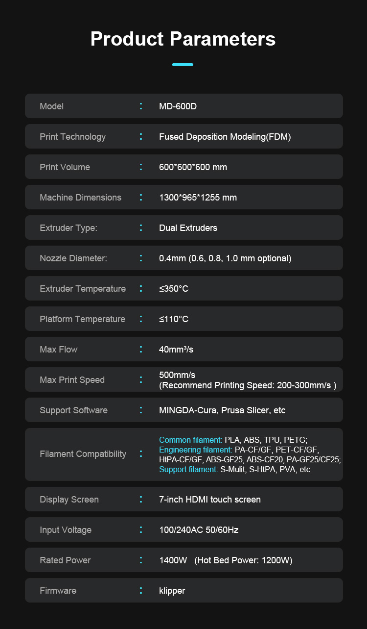 The MD-600D 3D Printer is a powerful professional-grade 3D printer with a printing size of up to 600mm cube. Featuring its high-temperature 350 degrees hotend dual extruder and innovative rapid printing capabilities, it is designed to quickly print large industrial parts with complex structures using industrial-grade materials.
