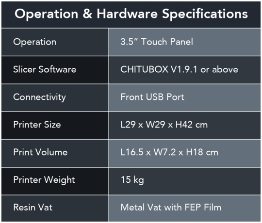 | Print Speed | 80mm/hr (Depends on resin used and layer height) |